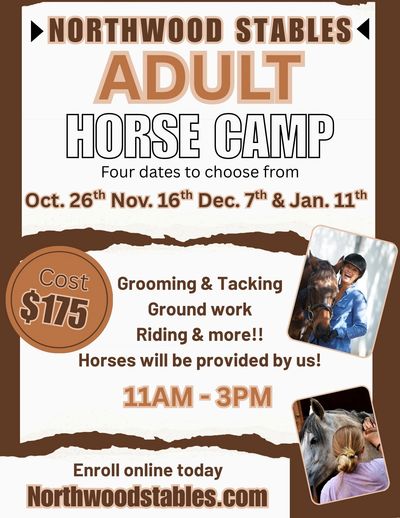 Have you ever wanted to fulfill the dream of being around and riding horses? Or have always been curious to start or get back into it? Come Cozy up with coffee, tea, or Apple cider that's provided as you spend the day working with horses. Includes grooming, ground work, and riding! Invite a friend to sign up, or come and meet new people. Only 6 spots available each day, they will fill fast! Come to one or all four!